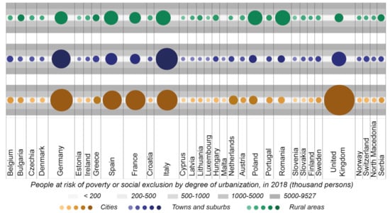 Share of population at risk of poverty or social exclusion by degree of urbanization in 2018. Source of data: EUROSTAT.