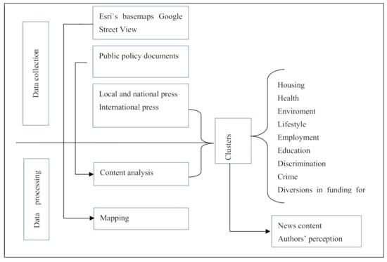 - Data collection involved, on the one hand, the identification of spatial location using ESRI Online resources, OpenStreetMap basemap and Google Street View images that render the physiognomy of the analyzed areas. On the other hand, we selected several public policy documents that regulate the phenomenon of segregation of Roma communities in Romania (laws, action guidelines) and also some local/national and international press articles published in the reference period 2010–2020, which outlined various aspects of the Roma communities under study. Often, the choice of media sources to render the factual reality as objectively as possible proved to be a difficult process as a number of factors intervened, many of them related to the politicization of media, state development level and the dependence of media on various decision makers [43]. Attributes such as intelligibility, popularity, experience and media labelled “traditional” [44,45,46] were considered in selecting media sources that would provide valuable information for this study (Ziar de Cluj, Monitorul de Cluj, Romania Insider, Adevărul, Ziar MM, Turnul Sfatului, Tribuna, Ziua de Vest, Al Jazeera, France 24, The Guardian, BBC, The Sun, Daily Mail, Telegraph, etc.).