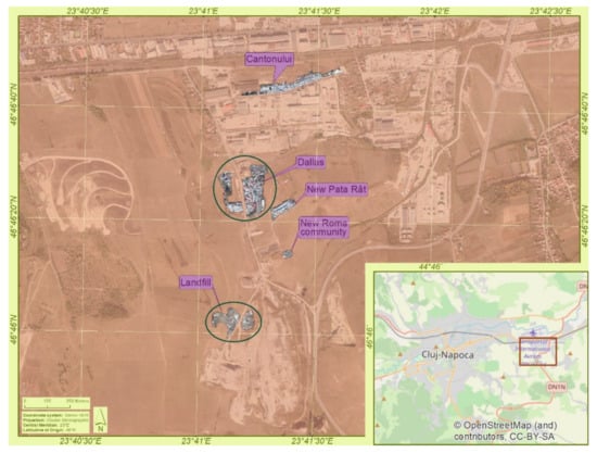 The first analyzed marginal settlement is that of Pata Rât, in Cluj-Napoca city (Figure 3). It is an intensely publicized informal housing area of about 1500 people. It consists of four colonies, namely: Dallas colony and the colony located on the landfill, both set up in 1960–1970; the colony on Canton Street, formed after evictions from other areas sheltering homeless people; and the New Pata Rât colony (area called “green hill” and Platanilor Street), formed as a result of setting up ten modular houses and the forced relocation of some evicted families from the central city area [54].