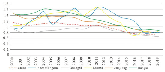 2.2. The Impact of the Resource Industry on China’s Industrial Structure