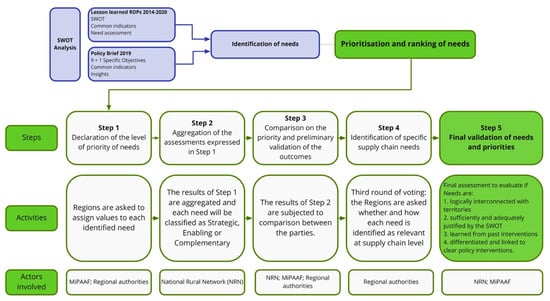 Achievement of this goal will require integration of the need to build a coherent, unified NSP with a clear national political vision and the need to represent the priorities expressed by the regional authorities of the various territories. Figure 1 is a schematic of the process co-developed by the Ministry of Agricultural, Food, and Forestry Policies (MIPAAF) and the National Rural Network (NRN) that will be completed in the following months to attain validation of final needs and priorities. This study, aimed at informing steps 1 (declaration of the level of priority of needs) and 2 (aggregation of the assessments expressed in step 1), analyses and tests the prioritised needs that resulted from a cumulative model.