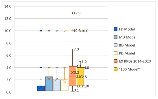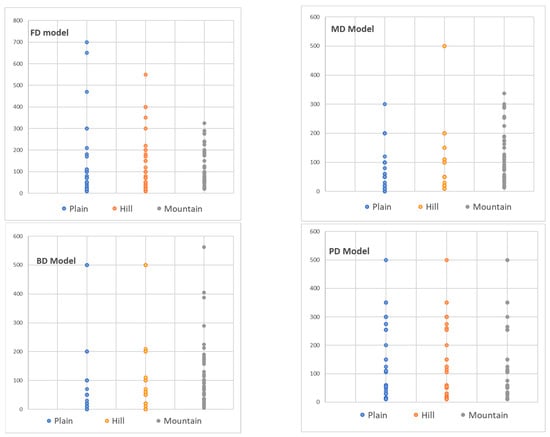 The dot plots of models’ distributions: FD Model, MD Model, BD Model, and PD Model.
