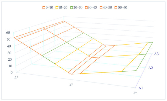Gained results are conferred in the range of the color properties of grain color properties of Alternaria. Gained results are conferred in the range of the color properties of Alternaria spp. contaminated wheat grains [49]. Wheat grain samples were significantly different (p < 0.05) in terms of all measured color parameters (L*, a*, b*). Control wheat grain (A1) samples were significantly different in terms of lightness and dominant wavelength, compared to wheat grain samples (A2) and (A3), which have shown significant difference (p < 0.05) compared to A1, but without any statistically significant difference (p > 0.05) between themselves, nevertheless numerical differences (Figure 1), respectively.