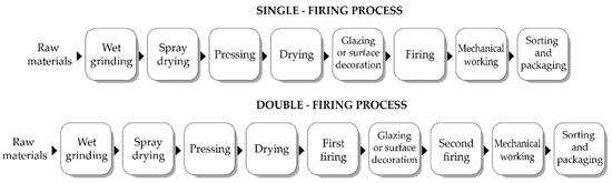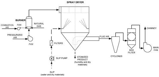 The production process (Figure 2) generally starts with the storage and the preparation phase of the raw materials, consisting of two main operations: wet grinding and water content adjustment [38]. Wet grinding technology, which uses a continuous or discontinuous drum mill, can reduce particle size, dust pollution, and provides a good homogenization [39]. Subsequently, the aqueous suspension (“slip”, with a water content of ≅30%) obtained from the wet grinding is dried and transformed into spherical granules by way of the operation called spray drying.