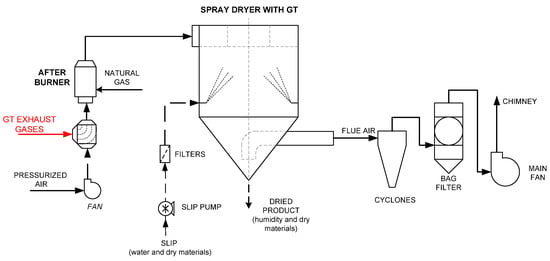 Simplified layouts of GTs and ICEs thermally integrated with a spray-dryer are presented in Figure 4 and Figure 5, respectively.