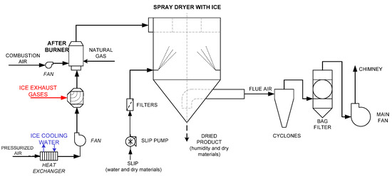 The rest of this manuscript is organized as follows. In Section 2, a synthetic description of the ceramic tile production process is presented, and emphasis is given to the detailed explanation of the spray dryer technology. Thermal integration with the CHP units, contributing to satisfy the heat consumption of the dryer unit, is presented with schematic layouts of the integrated system. The research method, data collection, and energetic performance indexes, ad hoc defined for the purpose of this analysis, are outlined in Section 3. Section 4 presents and discusses the main results of the study. Finally, in Section 5, the conclusions of the study are highlighted along with the future steps of the project.