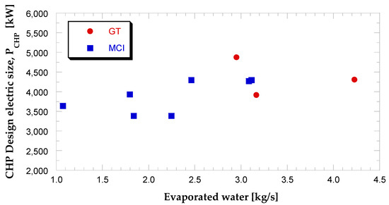The preferred choice in terms of CHP prime mover is the internal combustion engine, with seven out of ten installations. Figure 6 shows the design electric power of the CHP prime movers plotted against the average annual mass flow rate of evaporated water. Blue squares in the figure represent the ICE units while the red circles represent GT units. The electric size of the installed CHP units was between 3.4 MW and 4.9 MW with an average value equal to 4 MW.