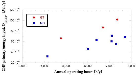 Figure 7 shows the electric efficiency values of installed CHP units plotted versus design electric size. ICE units are characterized by higher efficiency values, in the range 42–44%, compared to GTs whose values hardly exceed 30%. This outcome is also confirmed by the data reported in Figure 8, where the primary energy consumption of CHP units is plotted versus annual operating hours. Annual primary energy consumptions are in the range between 32106 and 102106 kWh/y, significantly higher for gas turbines compared to combustion engines for similar values of operating hours. Five CHP units reached operating hour values above 7000 h/y, three were between 6000 and 7000 h/y, while the remaining two were in operation for about half the time during the entire year (i.e., operating hours between 4200–4800 h/y).