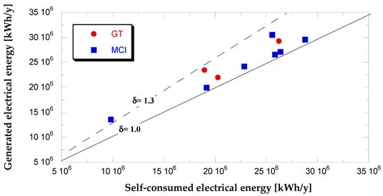 In Figure 9, the generated electrical energy is compared to the electricity demand of the facility. The black continuous line represents a value of δ equal to one (i.e., the case of self-consumption of the whole CHP generated electrical energy). As observed, the value of δ was higher than one in all of the analyzed cases. In particular, in six installations, the surplus of electricity was marginal (i.e., δ between 1.03 and 1.08), suggesting that the design and the load regulation strategy of the CHP units were targeted to meet the request of the facility. In the remaining cases, a modest surplus of electricity was generated (δ between 1.10 and 1.25). Only one case showed a significant amount of electricity generated compared to self-consumption (δ equal to 1.39).