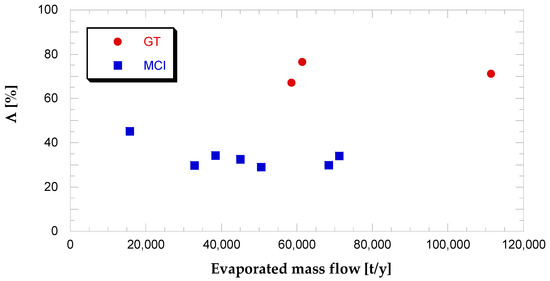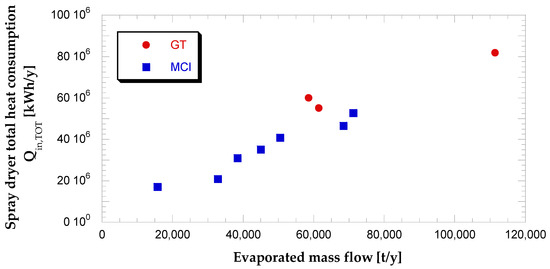 The total heat consumptions of the spray dryer units are plotted in Figure 10 as the function of annual evaporation capacity. As expected, an increase in thermal energy required for the drying process was observed as the evaporative capacity increased. The obtained trend was almost linear with values of QTOT in the range 15106–75106 kWh/y.