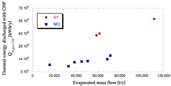 Thermal energy discharged with CHP and input to spray dryer versus the evaporated mass flow.