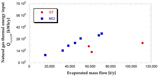 Contributions of CHP thermal energy, Qgas,CHP, and natural gas energy input, Qin,SP, to the dryer’s heat consumption are shown in Figure 11 and Figure 12, respectively. GTs showed a higher value of Qgas,CHP (between 40106–60106 kWh/y) compared to the ICEs, thus confirming that their limited electrical efficiency values (see results in Figure 8) had a positive effect on the amount of discharged heat. Percentage values of Λ for GT units, as shown in Figure 13, were between 67% and 77%. In contrast, in the case of ICEs, the contribution of thermal energy discharged with exhaust was limited (Qgas,CHP, in between 8106 and 14106 kWh/y), resulting in Λ values between 30 and 45%. It must be highlighted that the value of Λ seems to be dependent only on the technology used as the CHP prime mover, not being influenced by the size of the spray dryers (i.e., amount of evaporated water).