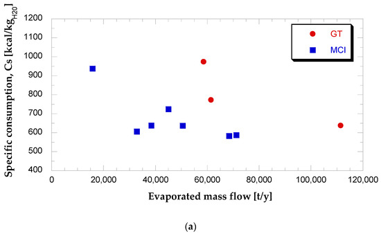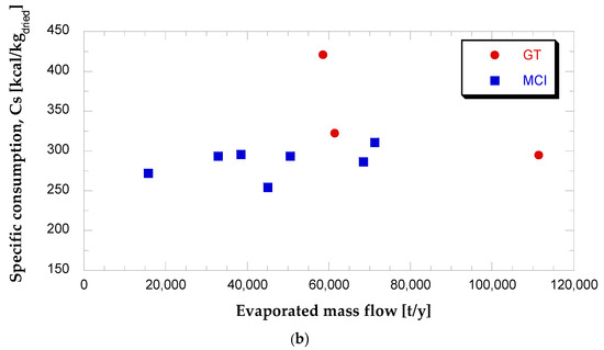 Finally, the spray dryers’ specific consumption is presented in Figure 14, referred to as the mass of evaporated water (Figure 14a,b) and to the mass of dried product.