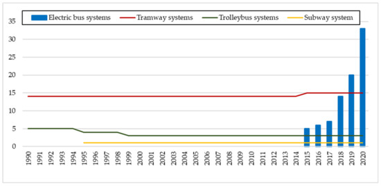 The turn of the 1980s and 1990s brought Poland a socio-economic transformation, whose consequence was the departure from centrally financed public transport in cities in favor of transport organized and financed by local authorities. In 1990, five trolleybus transport systems and 14 tramway networks operated in Poland (Figure 1) [38,39,40]. The economic decline of the 1990s, the underinvestment in the infrastructure and the rolling stock led to the closure of two trolleybus systems in Słupsk and the route connecting Warsaw and Piaseczno. The tram transport systems survived the difficult period, but the network coverage was systematically reduced. In particular, this process concerned suburban tramways in Łódź and tramways in the Katowice Agglomeration. In 1995, the first subway line in Warsaw, which had been under construction for several years, was launched.