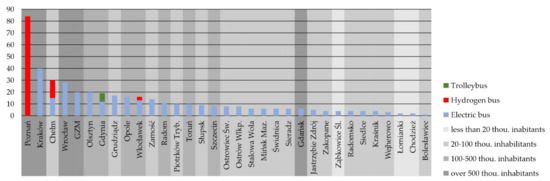 All applications submitted in just two weeks concerned the purchase of 431 vehicles. Applications concerning the purchase of electric buses dominated with a total of 322. Moreover, the purchase of 102 hydrogen buses and 7 trolleybuses was planned. The applications came from various cities and entities, as presented in Figure 3. The largest complex project came from Poznań and regarded the purchase of 84 hydrogen buses with the accompanying infrastructure. A project from Krakow for 40 electric buses placed second. Further applications were made for a smaller number of vehicles. Particularly noteworthy is the small town of Chełm, which applied for subsidizing the purchase of 15 electric buses and 15 hydrogen buses with the additional infrastructure. Small towns dominated among the applicants. Three of them are very small towns (less than 20,000 inhabitants): Chodzież, Łomianki and Ząbkowice. Towns with up to 100,000 inhabitants constituted the most numerous group—18 of them. Large cities (from 100,000 to 500,000 inhabitants) were represented by seven of them, and five applications were submitted by very large cities (over 500,000 inhabitants), including one metropolitan union. In total, 33 applications were submitted in the first phase of the call for proposals.