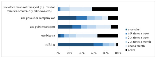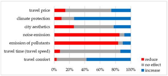 Answers to the next question allow us to deepen the knowledge about the respondents’ preferences in regards to electric vehicles in public transport. The issue concerned the impact of the use of such means of transport on various organizational and functional aspects, both related to travel, vehicles and life in the city. For each aspect, one had to choose one of the options “increase”, “has no effect” or “reduce”. The obtained responses proved considerable public awareness of the positive impact of electric transport on the place of its operation. In two categories: noise and pollution, approx. 85% of the responses proved knowledge about the reduction of emissions thanks to the use of electric vehicles. Simultaneously, 74% of the respondents believed that this type of vehicle affects improvements in climate protection. Among the responses regarding the travel cost and time, responses indicating “no effect” dominated, although in fact there is a priority for trams in Polish cities, thanks to separate tracks. Information that for the majority of respondents (over 52%), the existence of collective electric transport infrastructure did not affect the city’s aesthetics is also vital. Almost 58% of the respondents indicated that the use of electric vehicles in public transport increases the comfort of travel (Figure 7).