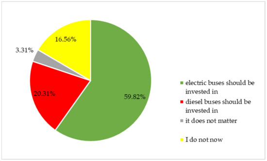The last discussed question concerned the development policy for public transport. The respondents were asked the following question: “Electric buses are almost twice as expensive as diesel buses. If your city authorities had a choice to buy five electric buses with the necessary infrastructure or to buy ten diesel buses (both investments would cost the same), which should be chosen in your opinion?” The answers were supposed to confirm the hypothesis that pro-ecological awareness prevails in the society, and media reports on the development of electric buses as well as their dynamic diffusion in Polish cities contribute to an increase in popularity of this means of transport. Analysis of the obtained responses allows us to conclude that the hypothesis has been confirmed (Figure 9). Most of the respondents chose the purchase of electric buses, despite their smaller number, and lower availability. Slightly less than 60% of the responses concerned this type of vehicle. Slightly over 20% of the respondents indicated diesel buses. For 3% of the respondents, the type of bus did not matter. Over 16.5% of the surveyed participants were unable to provide a specific answer.
