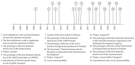 The domestic production of vehicles was the main support for the development of electrified transport in Poland. After the political changes, many foreign bus manufacturers moved their production to Poland. An important place in this process was taken by a domestic company derived from the German Neoplan—Solaris Bus and Coach, which produced diesel buses, then trolleybuses and trams, as well as electric buses [45,46]. Other manufacturing companies in Poland also started producing electric buses. Foreign manufacturers, e.g., the Czech SOR and the Chinese BYD, also made attempts to supply such vehicles to Poland. Out of 33 Polish cities with electric buses, Solaris buses operate in 27, another Polish brand Ursus in 4, in 2 the Czech brand SOR, as well as Automet and MMI in individual cities.