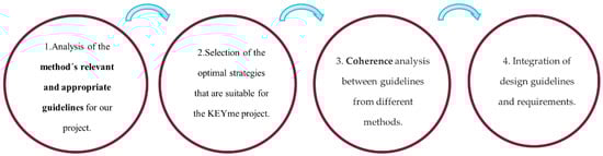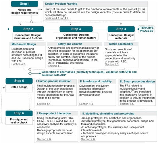 Its application in the KEYme project starts with the identification of special needs of the user; through an iterative process (Figure 1), different methods were analyzed, selected and integrated: conventional design (like the Functional Analysis Screening Tool (FAST), Quality Function Deployment (QFD), Analytic Hierarchy Process (AHP) and Hierarchical Task Analysis (HTA), among others), specialized guidelines in universal design [] and inclusive design [], participatory design [], collaborative design [] or design methodologies for people with special needs [] as well as smart toy design guidelines [], concluding in the definition of the design methodology for the KEYme project.