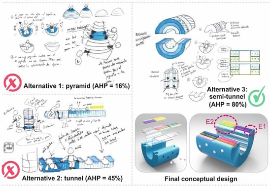 Subsequently, the most suitable one was selected with the AHP method (analytic hierarchy process) [], which assesses each alternative according to the fulfillment of different criteria and sub-criteria. In this case, the AHP hierarchy was structured modeling the evaluation with (1) the design goals 1 to 7, (2) alternatives 1, 2 and 3 for reaching the goals and (3) a group of criteria and sub-criteria that relate the alternatives and goals: (i) suitability for sensory stimulation (somatic, vestibular, visual, auditory, tactile, cognitive, motor and language); (ii) formal design (structure, materials, innovation, environmental impact and integration in space); (iii) safety and comfort (stability, toxicity, anthropometry and biomechanics) and (iv) usability (affordance, visibility, mapping and feedback). After carrying out the pair-wise ranking, calculating the numerical dominance matrix, obtaining priority concepts and checking the consistency of the priority concepts, the scope of the design objectives for each alternative was quantified: 16%, 45% and 80% for alternatives 1, 2 and 3, respectively.