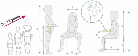 With these requirements, an anthropometric study of the child population was carried out, and the product was sized according to each anthropometric variable (Figure 5):