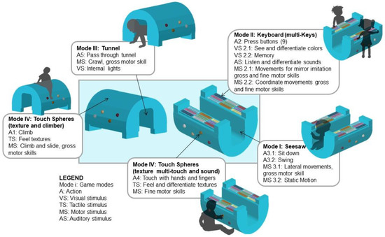 The dimensioning of the toy was established according to the defined user target: child population aged between 3 and 12 years. The selection of this wide age range is due to the fact that the goal of the project was to create adaptive AT for different users, and therefore one of the strategies used was to organize the game modes by age: (i) modes I, III and IV suitable for younger children (3–7 years), and (ii) mode II adapted to older children (7–12 years). In addition to this, the product as a whole must allow the user to stand and sit while playing, perform movements on it (slide, climb, crawl) and allow for smaller comfortable movements (grasp, press, pinch, squeeze, etc.) with adequate access and visibility of the interface.