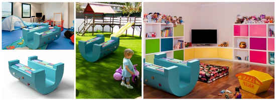 Finally, KEYme allows for the interaction between several pairs of players, creating spaces for collaborative play. The structural design of the product makes the result adaptable to different contexts of use. Figure 10 shows the integration of KEYme in indoor (game rooms, home or school) and outdoor environments.