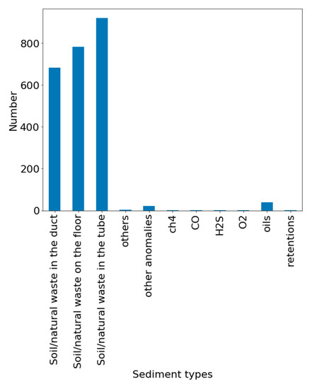 The sediment level is the main feature of the study. Sediments are made up of different elements, such as the ones described in Figure 1. A major part of the sediments in the data are soil and natural waste (first three columns on Figure 1), which comprise 97% of the total amount of the sediments encountered. These are followed by sediments formed of oils and fats with 1.5% of appearance, and 1% of sediments formed of wipes or other non-recycled objects. Other sediments are made up of non-frequent actions that cause the appearance of retentions and gaseous elements.