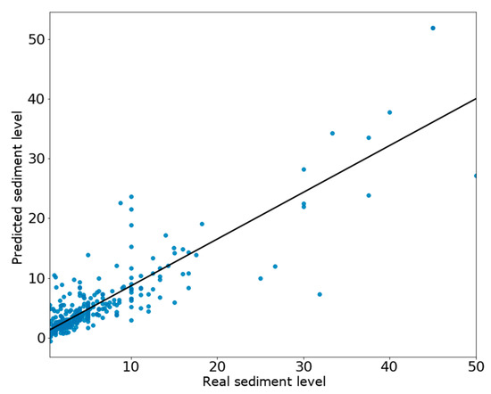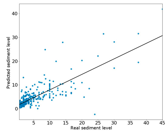 The ANN model is the best in the batch. Figure 2 shows the predictions of the model and compares them to the real value in the test set. The first thing to notice is that many sediment levels with high value are predicted with lower values, with errors of at least 10%, and in some cases reaching 20% of error. On low values, the behaviour is the opposite, and the model predicts higher values on observations with a low sediment level.