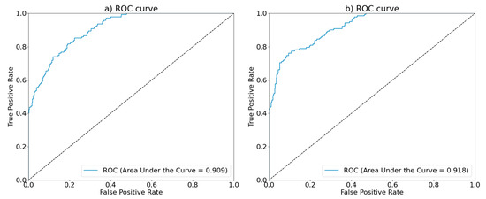 Receiver operating characteristic (ROC) curve and area under the curve (AUC) on a test set (a) Gradient Boosting; (b) Extra Trees.