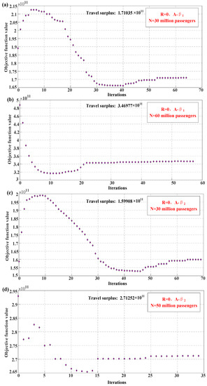 We studied the convergence of the global optimization algorithm proposed above, which is an important basis for further research on structural optimization of the comprehensive transport corridor. Figure 2 shows the model convergence analysis results of value distribution and travel demand at different times. We used the minimum value of f instead of seeking the maximum value of the objective function f. The abscissa represents the iteration times of the optimization algorithm when seeking global optimum, and the ordinate represents the objective function of the model, i.e., the travel surplus of the whole society. Figure 2a reflects the convergence of the algorithm when the travel time value distribution of the travel demand subject is β1 and the travel demand is 30 million. It is found that after nearly 65 iterations, the algorithm basically converges and finds the global optimum. At this time, the travel surplus of the whole society reaches 1.71 × 1011. When the demand increases to 60 million, the convergence effect of the algorithm is better. When the value distribution of travel time is β2, the results are similar to those in Figure 2b,c, and the algorithm basically converges, which shows that the algorithm in this paper is basically feasible. This is the premise of parameter influence analysis in the following paragraphs.