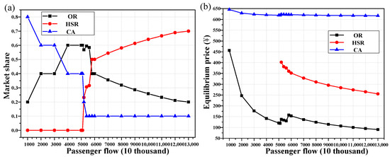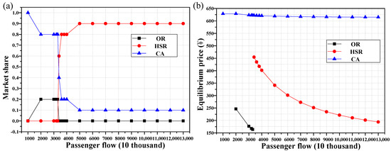 From Table 6 and Figure 3, it can be seen that when the time value distribution of travel demand is β1 and the travel demand is 10 million to 51 million, only two service modes need to be configured for the passenger transport corridor: conventional railway and civil aviation. Because the demand for high-speed railway is not enough to ensure its break-even operation, the high-speed railway will not be opened for the time being, otherwise the travel surplus of the whole society will be reduced. At this stage, with the increase of travel demand, the equilibrium fares of conventional railway and civil aviation are gradually reduced, in which the fare of former is reduced by nearly 75%, while the passenger flow sharing rate undertaken by conventional railway is gradually increasing from 20% to 60%. In contrast, the passenger flow sharing rate of civil aviation is gradually decreasing from 80% to 40%. In-depth observation of Figure 3a shows that when the passenger flow reaches between 30 million and 40 million people, the travel demand of conventional railway gradually exceeds that of civil aviation.