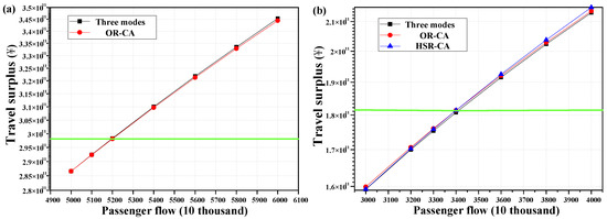 In order to better reflect the difference between the total travel surplus of the whole society realized by different service modes when the travel demand of the passenger transport corridor is different, we compared the social travel surplus realized by various travel modes, as shown in Figure 5. In the figure, (a) shows the comparison of the whole society’s travel surplus of different service modes when the main distribution characteristics of travel demand are A-β1. It focuses on the analysis that the travel demand of the corridor is between 50 million and 60 million. It is found that when the travel demand is less than 52 million, the whole society’s travel surplus brought by the two service modes of conventional railway and civil aviation transport is larger than that brought by the three service modes. Because of the high fixed cost, it is difficult for the high-speed rail to maintain its break-even operation, so the travelers who wish to choose high-speed rail have to turn to the other two ways. When the travel demand of the corridor is greater than or equal to 52 million, the travel surplus satisfied by configuring three service modes (conventional railway, high-speed rail and civil aviation) is greater than that of configuring only two service modes (conventional railway and civil aviation). At this stage, high-speed rail opening is proper, and planning high-speed rail will improve the travel surplus of the whole society.