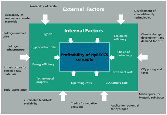 - Hydrogen is a carbon-free energy carrier. Since there is no carbon remaining in the product, HyBECCS approaches have a comparatively high cumulative CO2 capture rate and thus a larger specific GHG emission reduction potential compared to, e.g., BECCS technologies producing hydrocarbon-based biofuels [36,37,38,39].