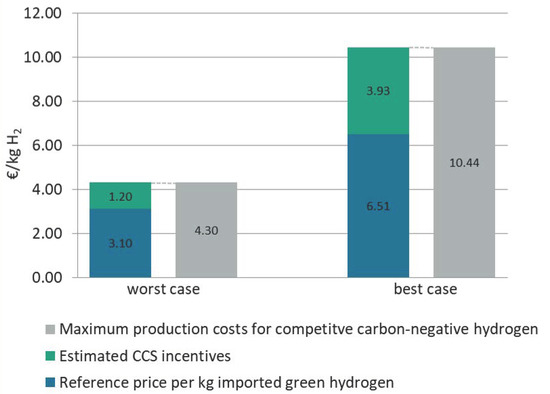 - Statista. Prognostizierte Kosten für die Wasserstoffherstellung in Deutschland im Jahr 2050. 2020. Available online: https://de.statista.com/statistik/daten/studie/1193246/umfrage/prognostizierte-kosten-zur-herstellung-von-wasserstoff-in-deutschland/ (accessed on 11 February 2021).