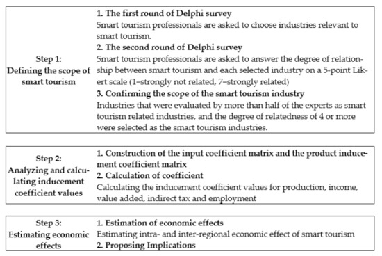 The analysis of this study involves three steps (see Figure 1). The first step involves conducting a two-round Delphi survey. Experts who are knowledgeable in smart tourism, smart cities, were involved. In the first round, 12 experts were asked to choose smart tourism-related industries among the 80 sectors reported in the inter-regional I–O table (two industries, mining products and the tobacco industry, which are not traded in Seoul, were excluded from the analysis). The industries selected by more than half of the experts were rated by the experts in the second round. The threshold was decided based on the narrow classification proposed by Jun et al. [34]. The experts were required to answer the degree of relationship between the concept of smart tourism and each selected industry on a 5-point Likert scale (1 = Strongly Not Related, 7 = Strongly Related). Industries with an average score of 4 or more were finally selected as the smart tourism industries. As this survey targeted smart tourism experts and professionals, we increased objectivity and expertise, and decreased possible risks caused by the researchers’ arbitrary determination. In addition, although a considerable number of studies have focused on smart tourism, more efforts are needed to clarify the definition and scope of smart tourism. Therefore, it was necessary to clarify the scope of what industries belong to smart tourism prior to estimating its economic effects.