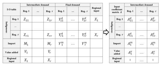 The second step involved constructing the input coefficient matrix () based on the regional I–O table (see Figure 2) [35]. The Bank of Korea has periodically published an annual inter-regional I–O table. The most current version is the 2013 I–O table, published in 2015 [36]. This table summarizes the transaction information of goods and services between industries that make up the national economy for a certain period (usually one year) [35].