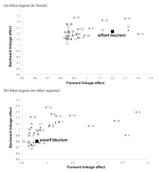 Table 6 and Table 7 show the results of the linkage effects in the intra-region and inter-region, respectively. In Seoul, the forward linkage effect of smart tourism is 1.202, which greater than 1 and shows a high level in comparison with other industries (Rank 5). The backward linkage effect (1.234) is also greater than 1 but shows a relatively low level in comparison with other industries (Rank 12). Therefore, in Seoul, the smart tourism industry can be identified as “intermediate primary production”. On the other hand, in other regions, the forward and backward linkage effects of smart tourism are found to be low. Therefore, the smart tourism industry in Seoul can be identified as “final primary production” from the perspective of other regions. However, since smart tourism is a combination of cutting-edge technologies and tourism (the service industry), it is not appropriate to refer to it as “primary production” [11]. Therefore, the smart tourism industry can be referred to as “intermediate production” in Seoul and “final production” in other regions, respectively. The intra-regional and inter-regional forward and backward linkages of smart tourism industries and other industries are depicted in Figure 5.