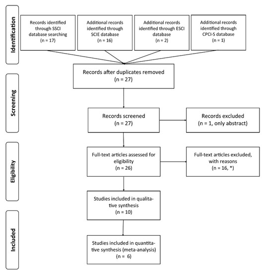 The scientometric search of articles identified a total of 36 documents from different databases in the Web of Science Core Collection (SSCI, SCIE, ESCI, and CPCI-S). There were 27 unique titles and abstracts (without repetitions; see Appendix E) and 26 full-text articles recovered and screened with the selection criteria defined with the PICOS tool.