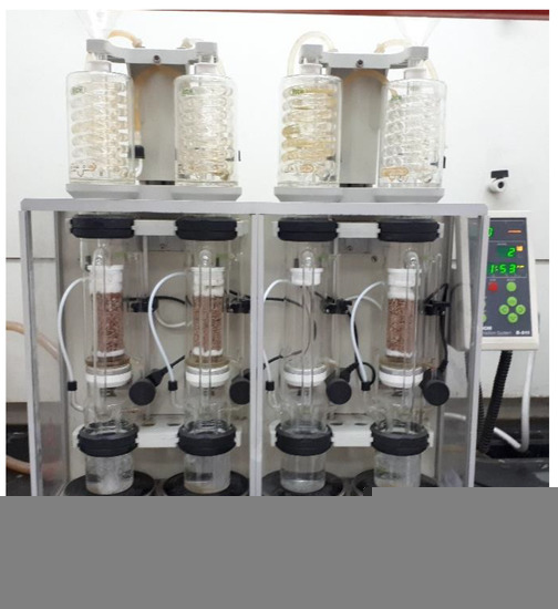 Fat extraction apparatus (Soxhlet apparatus).