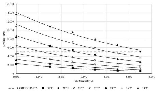 The DSR was used to estimate the viscoelastic behavior of the DSO-BMB at the intermediate temperature range from 13 °C to 31 °C. The fatigue parameter (G*sinδ) shown in Figure 4 indicates that the fatigue parameter was decreasing with the increase in the oil content and temperature. The Superpave limits the fatigue parameter to 5000 kPa at the intermediate temperature. It can be observed that the after adding 1.5% DSO the intermediate temperature range was reduced to beneath 22 °C. This reduction is attributed to the reduction in the complex modulus at the testing temperature caused by the softness of the binder. This concludes that the low temperature grade (PG) is reducing as well.
