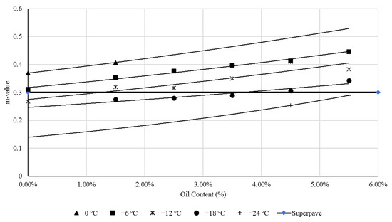 The BBR test was conducted to estimate the stiffness of the asphalt binder at different low temperature ranges varying from zero to −30 °C. Figure 5 shows the measured stiffness (at 60 sec) of BMB at different testing temperatures. The results indicated that the stiffness of the binder increases with the decrease in the testing temperature, however, the modified binder has a lower stiffness than the control binders. However, adding 1.5% bio-oil reduced the stiffness of the binder by 33.39%, 36.90%, and 19.44% compared to the 0.0% BMB at of 0, −6, and −12 °C, respectively. On the other hand, adding 5.5% oil to the binder reduced the stiffness by more than 70% at the test temperature of −6 compared to the 0.0% BMB. Figure 6 shows the results of the m-value of the binders at different test temperatures. It was shown that the addition of DSO to the binder increased the m value. However, the reduction in the temperature induced a reduction in the m-value. The 1.5% BMB had an increased m-value by 10.30%, 13.50% and 19.85% at the temperatures of 0, −6, and −12 °C, respectively, compared to the 0.0% BMB. In addition, the corporation of 5.5% DSO increased the m-value by 43.09% and 43.07% at the temperatures of −6 and −12 °C compared to the 0.0% BMB.