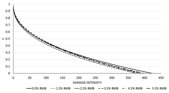 The fatigue behavior of the DSO-BMBs was estimated through the LAS test at the intermediate test temperature. The VECD graph (Figure 8) illustrates the damage intensity versus C parameter at the intermediate temperatures. The C damage parameter is defined as the ratio of the complex modulus value at any time to the initial complex modulus value of the binder (the value of G*sinδ at any time/initial value of G*sinδ).