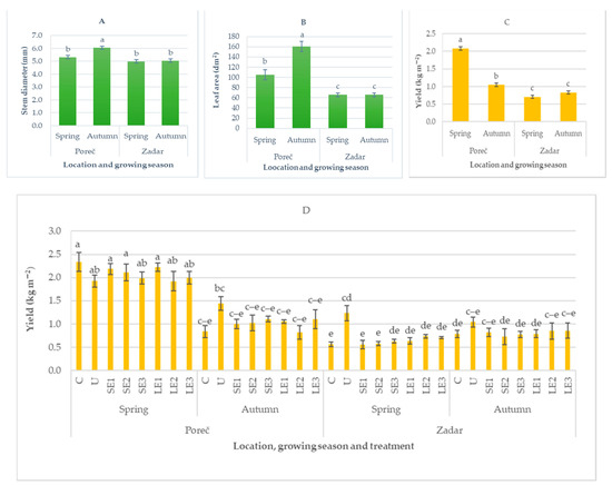 Influence of the interaction of three factors, treatment (T), location (L) and sowing season (S), on green bean vegetative growth parameters: (A) steam diameter, L × S; (B) leaf area, L × S; (C) yield, L × S; (D) yield, T × L × S. Results are expressed as mean ± standard error. Means with the same letter within the column are not significantly different at p ≤ 0.05 by Tukey’s HSD test.