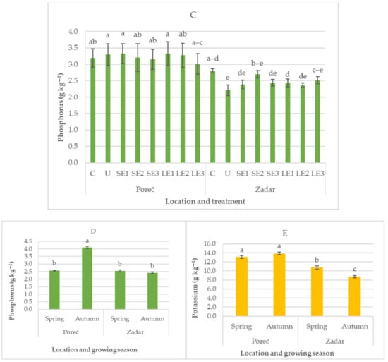 The interaction of location and season (L × S) was significant for the content of P at the Poreč location in the autumn season (Figure 3D).