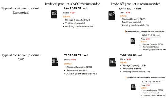 We further hypothesized that the provision of information about CSR would increase the evaluability of CSR information, which helps consumers to understand how good or how bad a CSR attribute is when making purchase decisions []. This suggests that, when reinforcement information about CSR is provided, CSR information plays a critical role in consumers’ purchase decisions, regardless of whether a CSR product is recommended or not, thus leading consumers to compare the CSR information of two products.