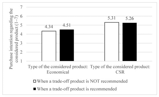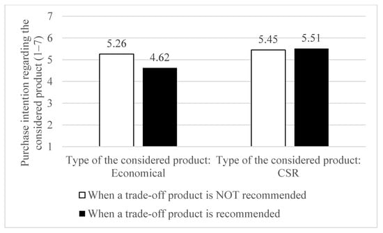 Purchase intentions were submitted to a two-way analysis of variance (ANOVAs) with type of the considered product (Economical vs. CSR) and whether a trade-off product is recommended (No vs. Yes). As expected and in contrast with the results of Experiment 1, we did not find an interaction effect (F(1,143) = 0.162, p = 0.688). Instead, the main effect of the considered product was significant; participants were more likely to buy the CSR product than the economical product (Meconomical = 4.42 vs. MCSR = 5.29, F(1,155) = 11.148, p = 0.001). This result indicates that, regardless of whether a recommendation was made or not, participants wanted to buy the CSR product, which supports Hypothesis 3 (see Figure 4).