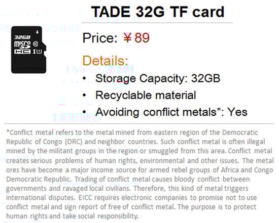 We recruited a total of 146 Chinese consumers through the same Chinese online survey website used in the previous experiment. As in Experiment 1, we employed a 2 (type of considered product: Economical vs. CSR) × 2 (whether a trade-off product is recommended: No vs. Yes) between-subject design. First, the participants were informed about the CSR aspects of TF cards, i.e., conflict metals, such as where they were mined from, how they were mined or distributed, and whether their use was associated with human rights, environmental, and other issues. The subjects were also informed that the EICC required electronic companies to refrain from using conflict metals (see Figure 3).