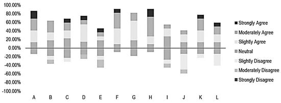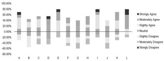 The reason for the higher IQRs could be because the questionnaire does not reference whether the impact is positive or negative and therefore the respondents may not have fully understood what they were answering. However, as 18% of the respondents identified statement L as the most significant driver, the result suggests correspondence with previous research showing policy makers as the main driving bodies for increasing the use of panelised systems [1,9]. Neutral views were found for statement B (Mdn = 4, IQR = 1.5), statement C (Mdn = 4, IQR = 1) and statement G (Mdn = 4, IQR = 1).