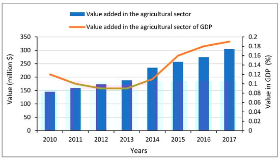 Value added (million $) and value added of GDP (%) of agriculture, forestry and fishery sector for the Qatari economy Qatar (1 QR = 0.27$) (2010–2017) [16,17].